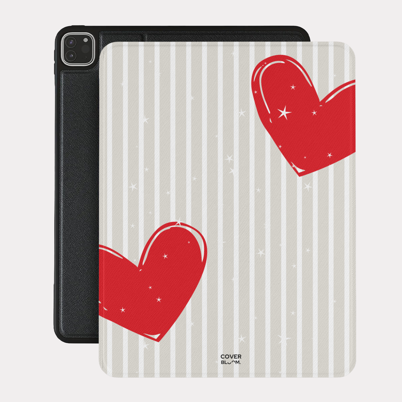 Celebrate everlasting love with Eternal Orbit Case! This design features two bold red hearts surrounded by delicate white stars, set against a timeless striped beige background—perfect for modern romantics.