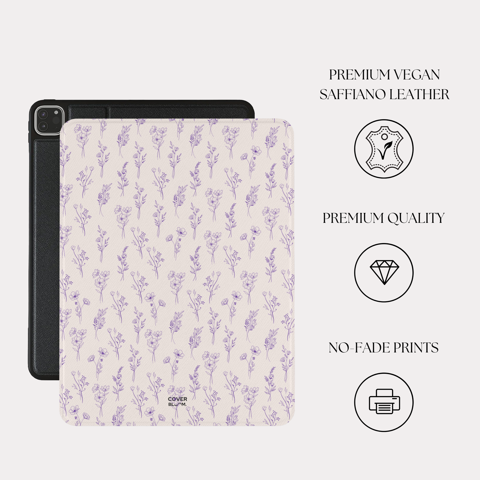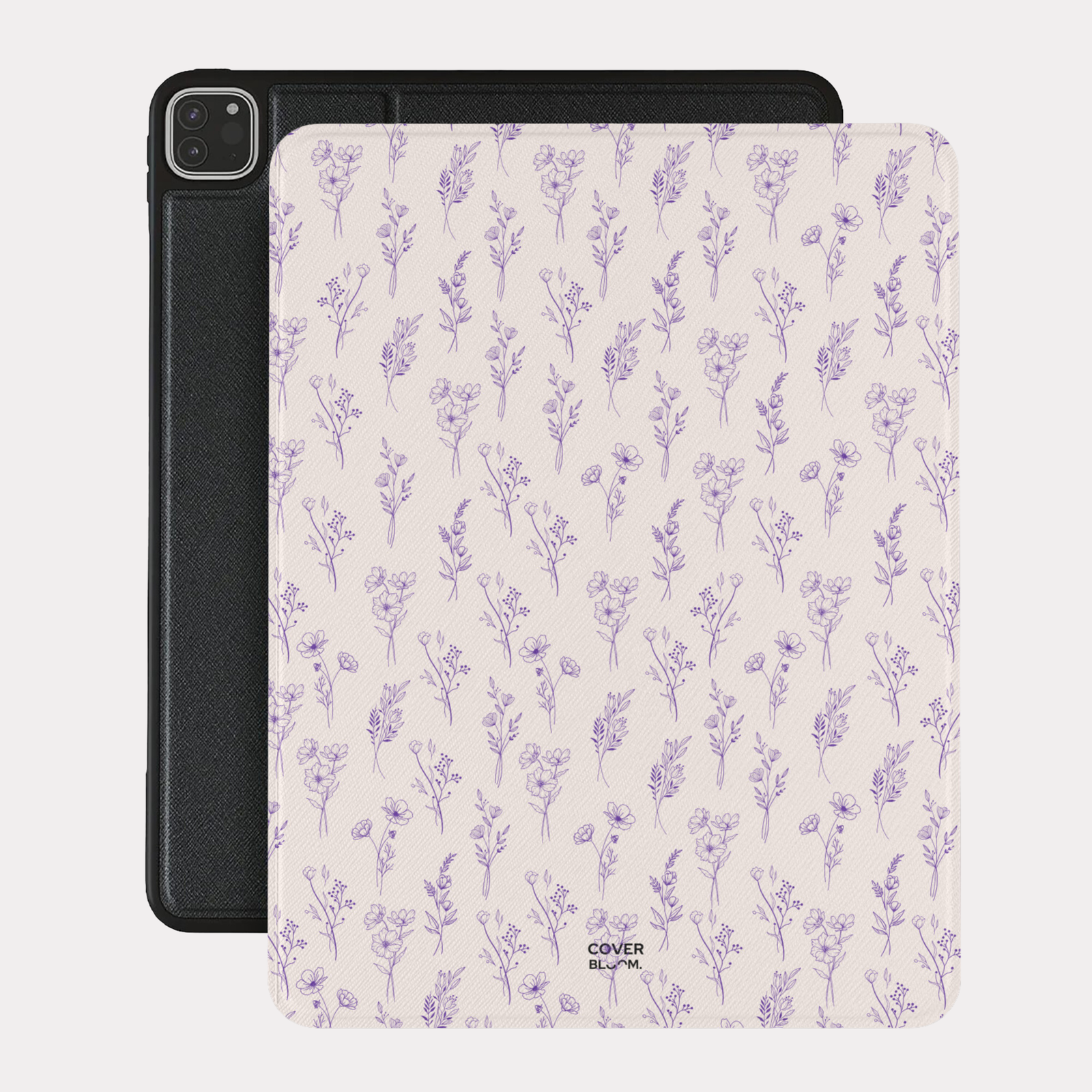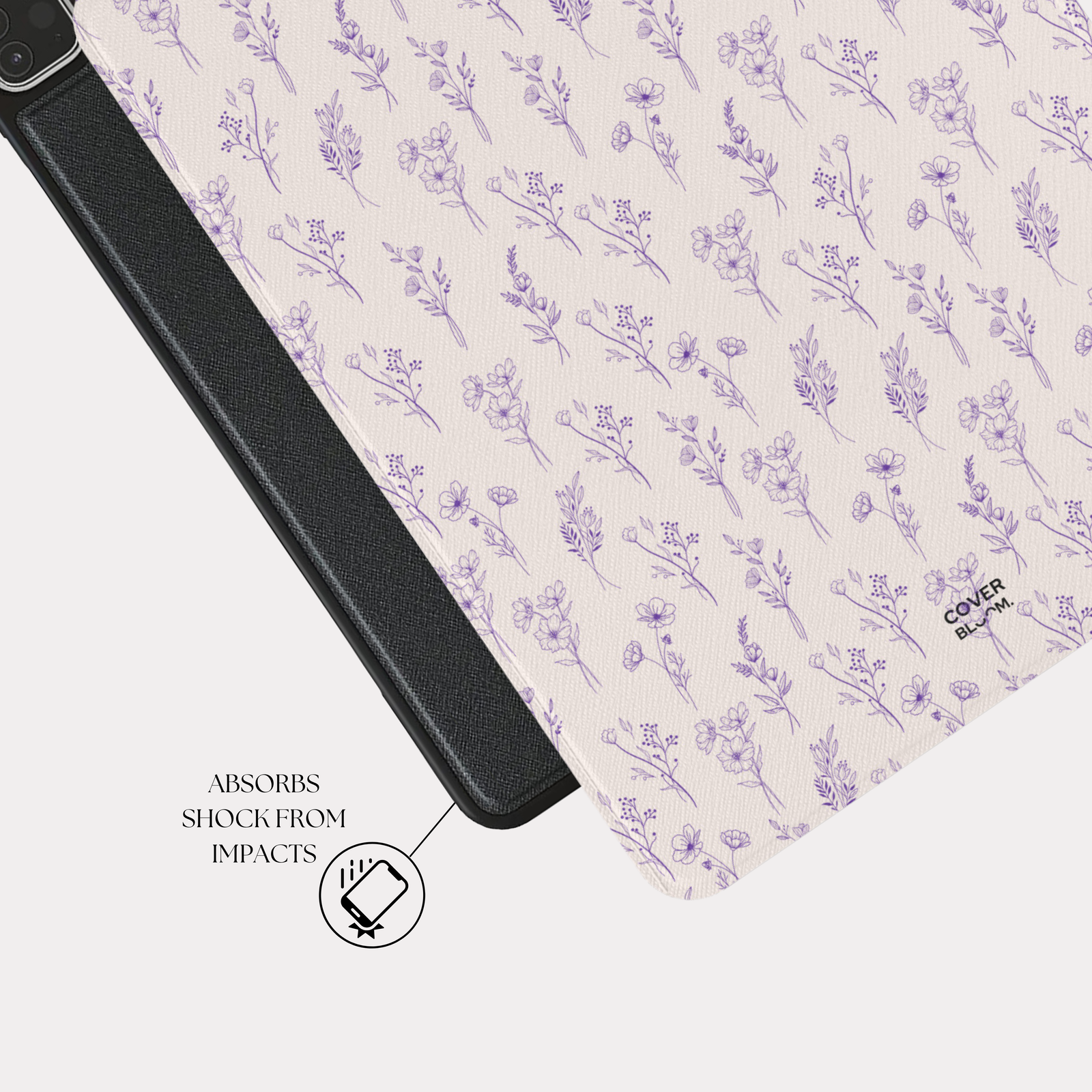 Elegant tablet case with violet floral design on a beige background. Durable, lightweight, and stylish – perfect for everyday protection and timeless beauty.